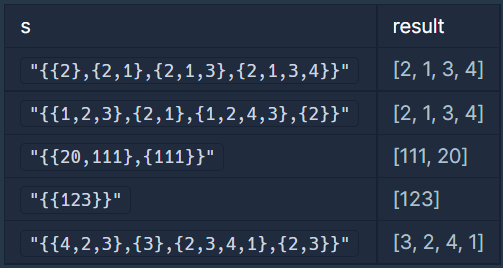 세번째 케이스를 보면, [111, 20]은 {111}, {111, 20} 또는 {111}, {20, 111} 이렇게 순서가 바뀌어도 모두 같은 튜플 (111, 20)을 나타낸다. 튜플 안에서만 원소의 순서를 지키면 되는것인데, 이때 문자열 s에서 가장 빈번하게 나온 숫자부터 차례대로 리스트에 담긴것을 확인할 수 있다.
